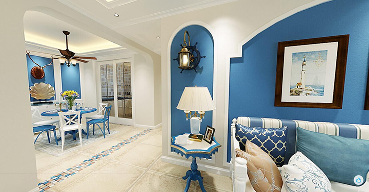 地中海风格,取材天然、造型圆润,主要的颜色来源是蓝色、白色、黄色等;建筑面积156平方,做的是纯设计,欢迎垂询!家装热线18397685528